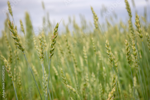 A green ear of wheat in an agricultural field
