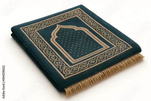 A green Quran with gold trim on the cover, elegantly designed and showcasing intricate detailing.