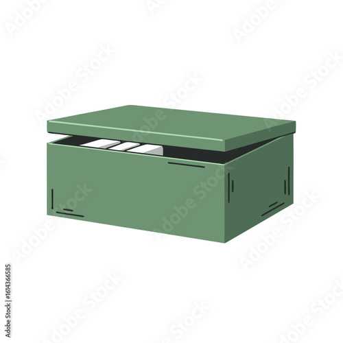 box, container, case, cardbox, crate, receptacle, holder, bin, chest, package, cardboard box, repository, archive, storage, filing, organiser, keeper, lid, cover, top, side, slot, tab, file, document, paper, paperwork, record, datum, information, letter, folder, index, collection, green, rectangular, simple, plain, clean, minimal, minimalist, modern, graphic, illustration, render, vector, design, isolated, white