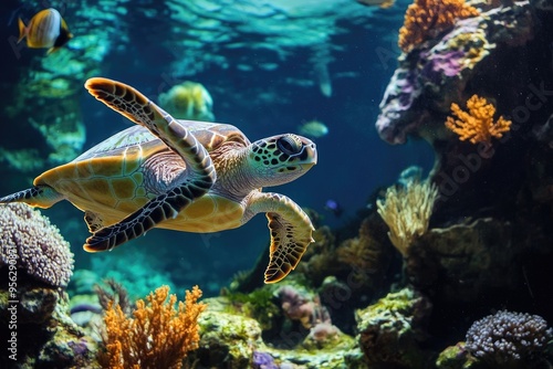 sea, turtle, green, water, ocean, reef, coral, animal, marin, life, nature, underwater, tropical, wildlife, fish, swimming, aquatic, shell, scale, flipper, head, eye, mouth, fin, colourful, vibrant, bright, blue, yellow, orange, brown, pattern, texture, background, beauty, ecosystem, photo, environment, habitat, conservation