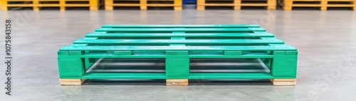 A green wooden pallet on a warehouse floor, showcasing a sturdy structure with a clean, industrial backdrop and a focus on functionality.