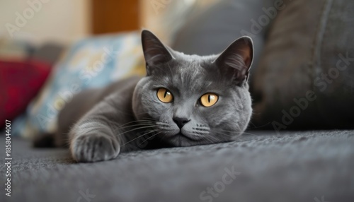 A grey cat with yellow eyes is laying on a couch in the living room