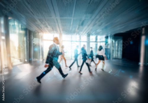 A group of blurry figures walk in a modern office building with large windows and a bright, sunny setting.