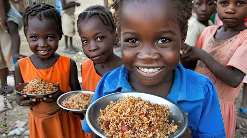 A group of children are smiling and holding plates of food