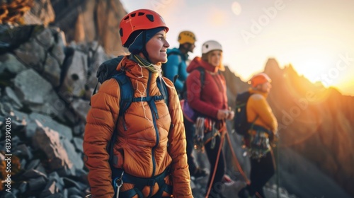 a group of climbers, showcasing advanced climbing gear in a setting of a challenging mountain peak, emphasizing adventure and achievement. -
