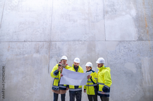 A group of engineers standing against concrete wall on construction site.