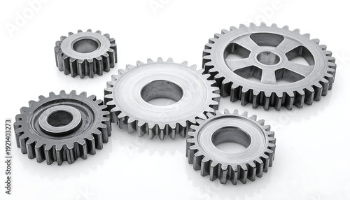 A group of five metallic gears with varying sizes, arranged on a bright white surface, reflecting light evenly