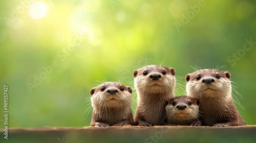 A group of four otters playfully posing in a serene, sunlit environment, showcasing their playful and curious nature.