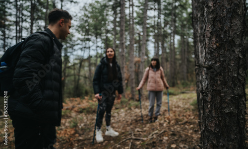 A group of friends walking together in a serene forest setting, engaging in hiking activities, surrounded by tall trees.