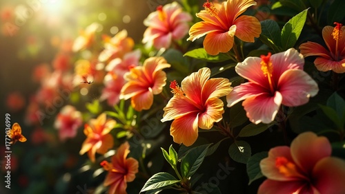 hibiscus, flower, group, blurry, background, flower petals, bloom, red, pink, tropical, closeup, soft, vibrant, aesthetic, nature, leaf, summer, flora, garden, plant, exotic, floral, detail, green, elegant, colourful, fresh, scenic, warm, sunlight, scenery, natural, growth, blurred, bright, wild, beauty, decorative, bush, landscape, view