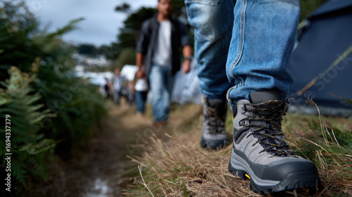 A group of hikers traverses a beautiful nature trail with tents in the background, showcasing outdoor spirit and adventure in a captivating natural setting.