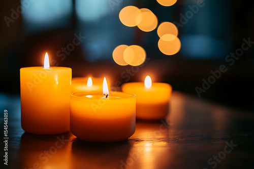 A group of lit candles with a soft glow illuminating the surrounding area creating a warm ambiance light