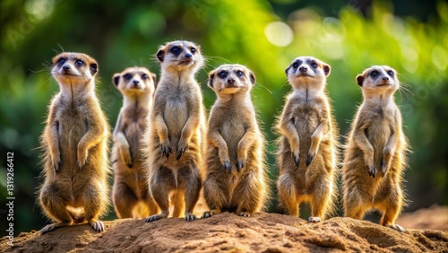 A group of meerkats standing upright on a mound of earth, basking in the warm sunlight, exhibiting a watchful and curious demeanor