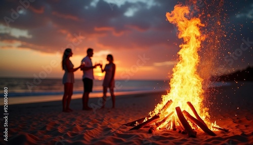 balefire, flames, glowing, particle, twilight, sky, sunset, horizon, colours, group, man, woman, white, socialise, toast, drink, beach, background, text, space, nature, lively, energy, gathering, night, dusk, beachside, warmth, celebration, friendship, diverse, ambience, coastline, evening, conversation, relaxed, atmosphere, oneness, vibrant, summer, glow, shadow, orange, pink, skyward, aurora
