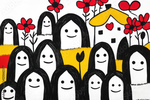 group, people, long, hair, smiling, holding, flower, cheerful, blithe, mood, happiness, sense, woman, illustration, conveying, young, female, happy, beauty, cartoon, drawing, art, lady, face, fashion, cute, design, pretty, portrait, character, human, white, background, style, fun, team, love, black, funny, summer, friendship, line, together, attractive, flat, dress, party, model, nature