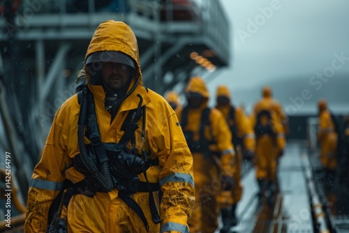 people, men at work, group, yellow, rain, gear, offshore, platform, rainstorm, teamwork, female, woman, male, man, winter, storm, weather, safety, uniform, emotion, resilience, effort, activity, occupation, work, industry, engineering, marin, energy, oil, gas, harsh, condition, tough, support, collaboration, team, professional, technology, modern, diversity, inclusion, equity, adult, three, lifestyle, copy space