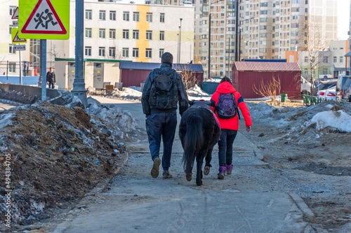A guy and a girl lead a pony along the sidewalk