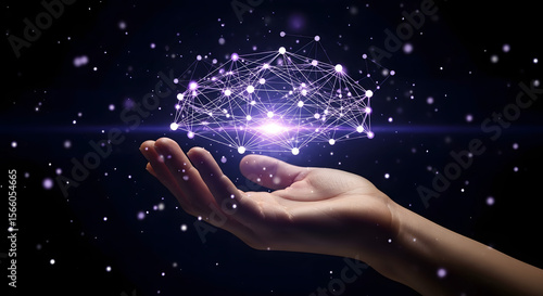 hand, palm, finger, network, node, connection, line, dot, point, light, glow, bright, purple, violet, dark, black, background, space, cosmos, star, digital, technology, innovation, idea, concept, brain, mind, intelligence, cognition, wisdom, datum, information, futuristic, science, abstract, design, graphic, illustration, energy, power, potential, growth, progress, future, development, global, connection, communication