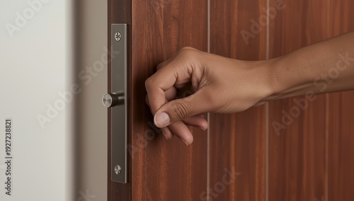 A hand grips a lever handle to open a wooden door. Close-up focus