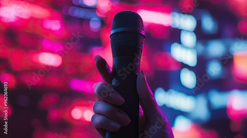 A hand holding a karaoke microphone, with lyrics displayed on a screen in the background, setting the stage for a lively performance