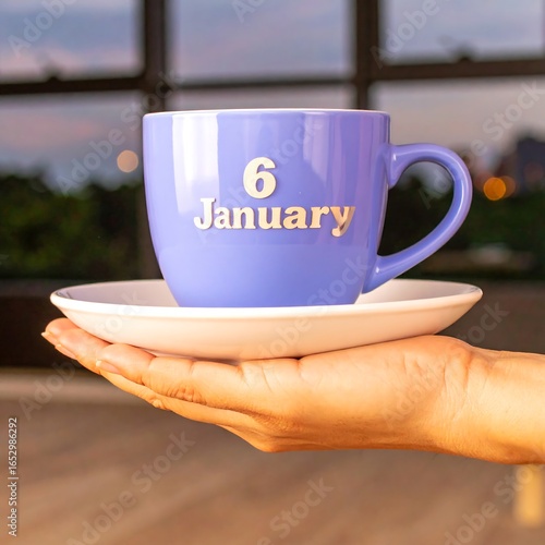 mug, purple, hand, jan, sixth, date, hot drink, tea, drink, beverage, cup, saucer, ceramic, home, morning, winter, day, calendar, time, number, 6, holding, display, showing, object, image, photo, background, window, blurry