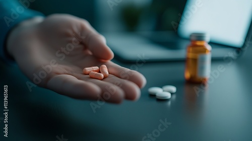 A hand holds several pills, with a prescription bottle in the background, suggesting themes of medication, health, and wellness.