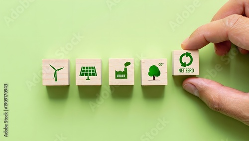 A hand placing a net zero cube among eco-friendly icons on a green background