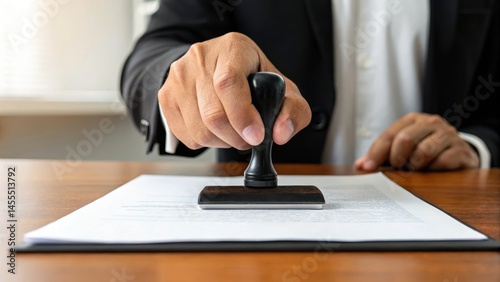A hand pressing a stamp onto a document, symbolizing approval or authentication in a professional setting.