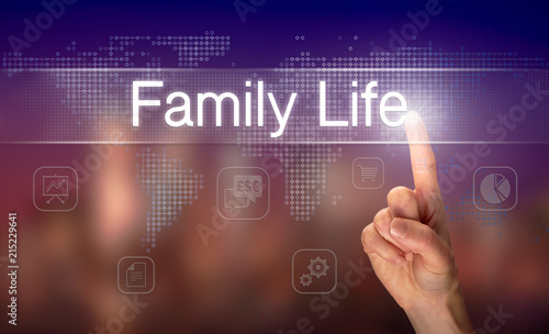 A hand selecting a Family Life business concept on a clear screen with a colorful blurred background.