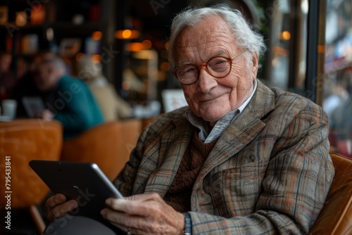 A handsome British old man in a business suit, wearing glasses, sitting in a cafe with a smile, looking at the iPad in his hand and smiling down, happy lifestyle, background blur, half-length