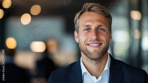 A handsome young businessman in a suit is smiling at the camera, standing against a blurred background of business people and an office interior.
