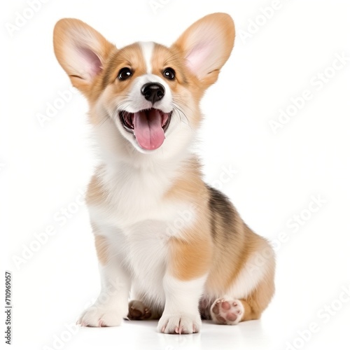 A happy corgi puppy with perked ears and an open mouth