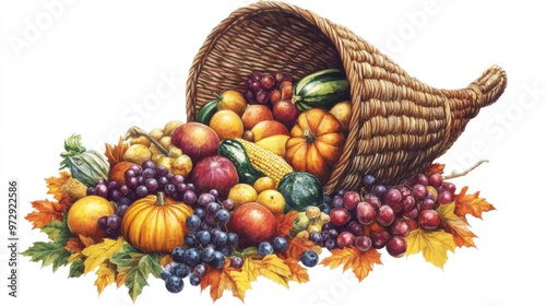 A harvest cornucopia filled with autumn fruits, vegetables, and leaves, symbolizing Thanksgiving abundance