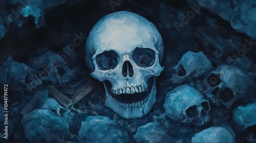 halloween, skull, death, tomb, ghost, pirate, treasure, glow, sea, ancient, curse, watercolor, ship, adventure, art, old, tone, block, rich, depth, blue, bone, cave, grave, dark, life, legend, scene, quest, coin, theme