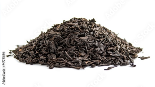 A Heap of High Quality Loose Black Tea Leaves isolated on a Pure White Background. Tea Brewing