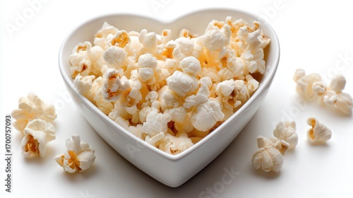 A heart-shaped bowl filled with fluffy popcorn sits against a white background, ideal for food blogs, recipes, or movie night promotions, The clean aesthetic makes it versatile for various uses,