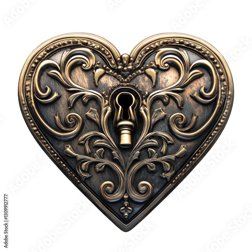 A heart-shaped lock with intricate detailing and a shiny surface, isolated on white background.