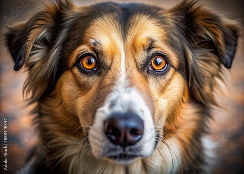 A heartwarming close-up portrait of a dog's face highlighting its striking brown eyes, surrounded by a soft furry complexion, evoking emotions in animal enthusiasts.