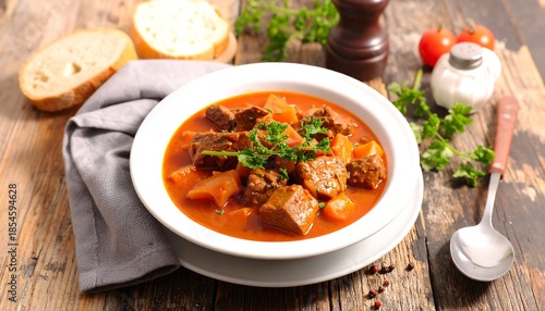 stew, food, dinner, lunch, meal, beef, meat, carrot, vegetable, soup, bowl, white, tomatoes, parsley, herb, bread, slice, rustic, wooden, table, spoon, salt, pepper, garnish, cooking, cookery, healthy, nourishment, delicious, flavorful, orange, brown, texture, warm, comfort, autumn, homemade, culinary, fresh, ingredient, epicure, tasty, appetence, closeup, perspective
