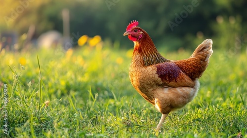 hen, chicken, bird, feathered, farm, poultry, rural, agriculture, animal, grass, field, green, meadow, nature, wildlife, countryside, farmhouse, barnyard, flock, feather, beak, eye, wing, tail, leg, ground, earth, sunlight, daytime, gold, brown, yellow, red, natural, beautiful, pretty, fresh, healthy, organic, pasture, landscape