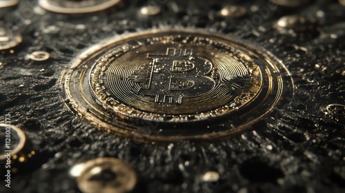 A highly detailed 3D rendering of a Bitcoin coin surrounded by digital currency symbols.