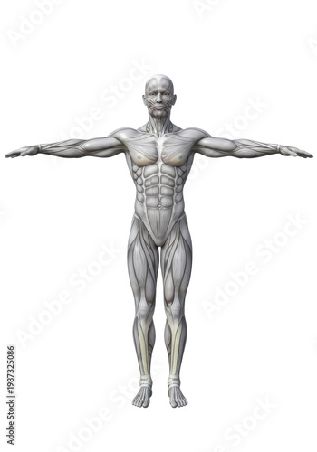 A highly detailed male humanoid model, untextured smooth matte gray, showcasing realistic musculature in a T-pose on a transparent background, digital anatomical representation