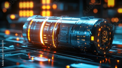 A high-powered battery with cooling vents, set against a futuristic background with glowing elements
