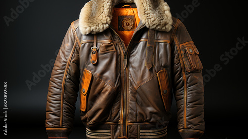 leather, jacket, brown, rugged, fur, collar, pocket, detail, quality, stylish, fashion, style, clothing, texture, vintage, casual attire, outerwear, trendy, design, craftsmanship, hard-wearing, attire, elegant, cool, warm, winter, comfort, luxurious, zip, modern, apparel, garment, bomber, classic, menswear, photo, studio shot, sophisticated, timeless, hip, fashionable, masculine, rich, biker