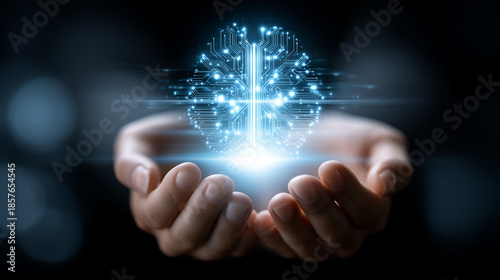 A high-quality cinematic close-up of human hands gently holding a glowing artificial intelligence symbol suspended in midair. The AI symbol appears as a luminous hologram made of l