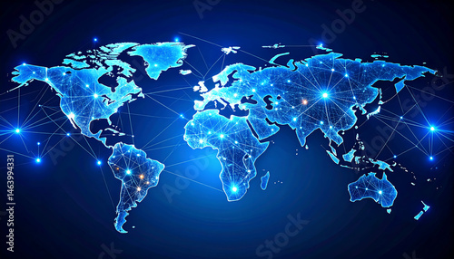 A high-resolution digital world map visualized with glowing blue lines and network nodes, symbolizing global data connections and modern technology.
