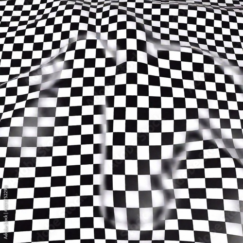 A high-resolution ultrarealistic digital artwork of a warped black and white checkerboard pattern. The image creates an optical illusion of depth and curvature, with the checkered grid appearing to be