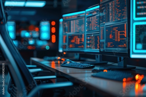 A high-tech control room equipped with multiple computer monitors displaying digital data and analysis, featuring advanced technology and modern design.