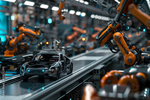 A high-tech factory with robots on an assembly line, manufacturing car body parts efficiently.