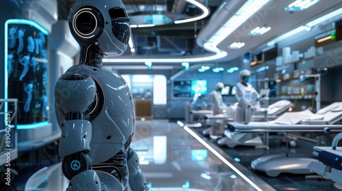 A high-tech medical facility with advanced healing technologies and robotic assistants.
